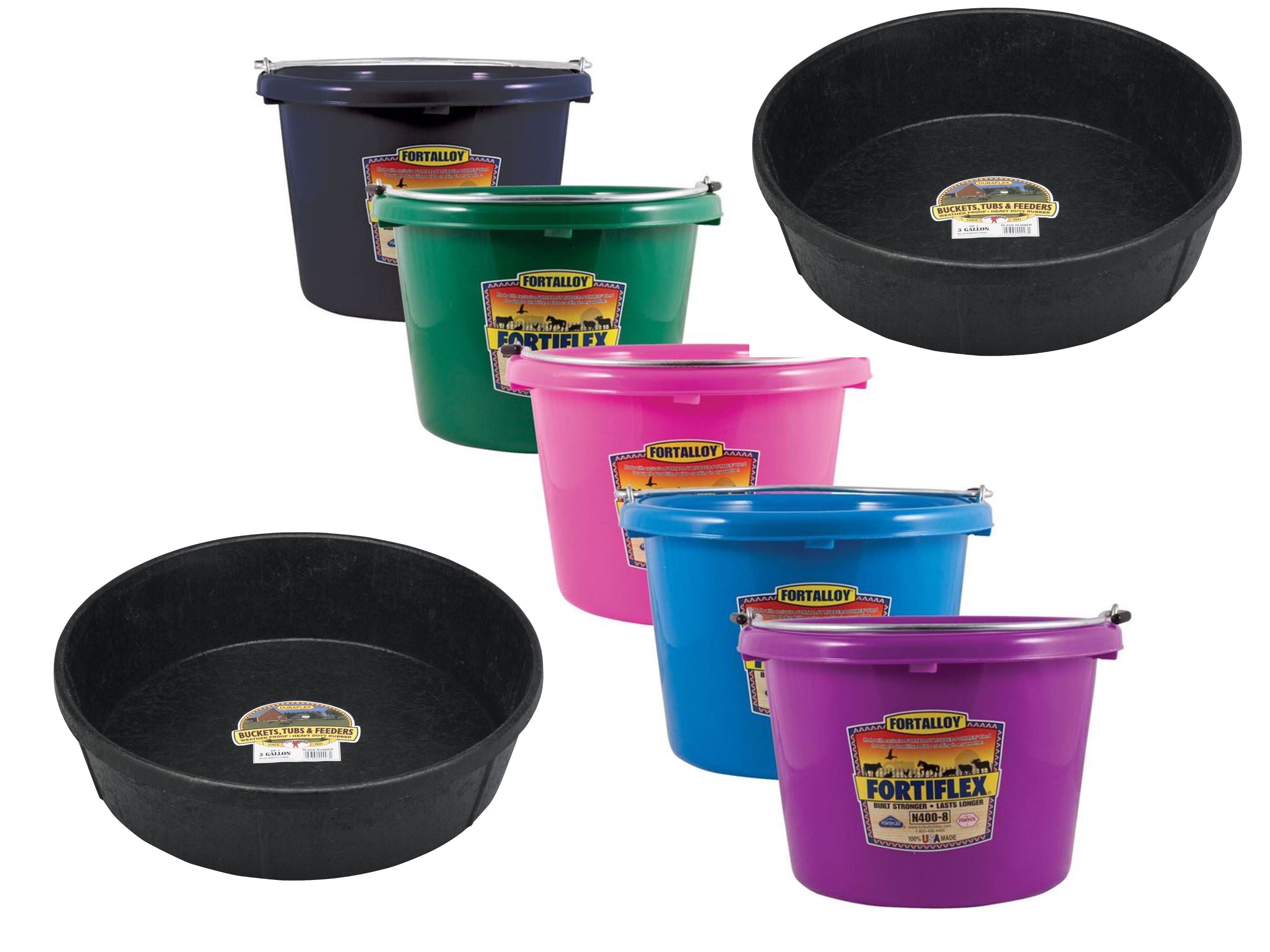 An 8-quart utility bucket is $6.99 at SS Tack, and TIER will need 25 ($175). The 6-gallon rubber feed tubs are $14.99 each, also at SS Tack ($375).
