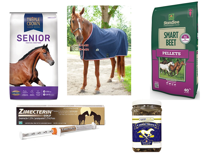 Jessie would like Triple Crown Senior Feed (a 50 pound bag is $31.49) and beet pulp (a 40 pound bag of Standlee Premium Western Forage Premium Smart Horse Beet Pellets is $18.79). She also needs dewormer (Zimerectin Gold Paste Dewormer is $17.99) and a fleece cooler for under her blanket (size 74, $72.95). If it's not too much, she would also love some soft treats (a two pound jar of Equine Edible's carrot cake treats is $18.99).