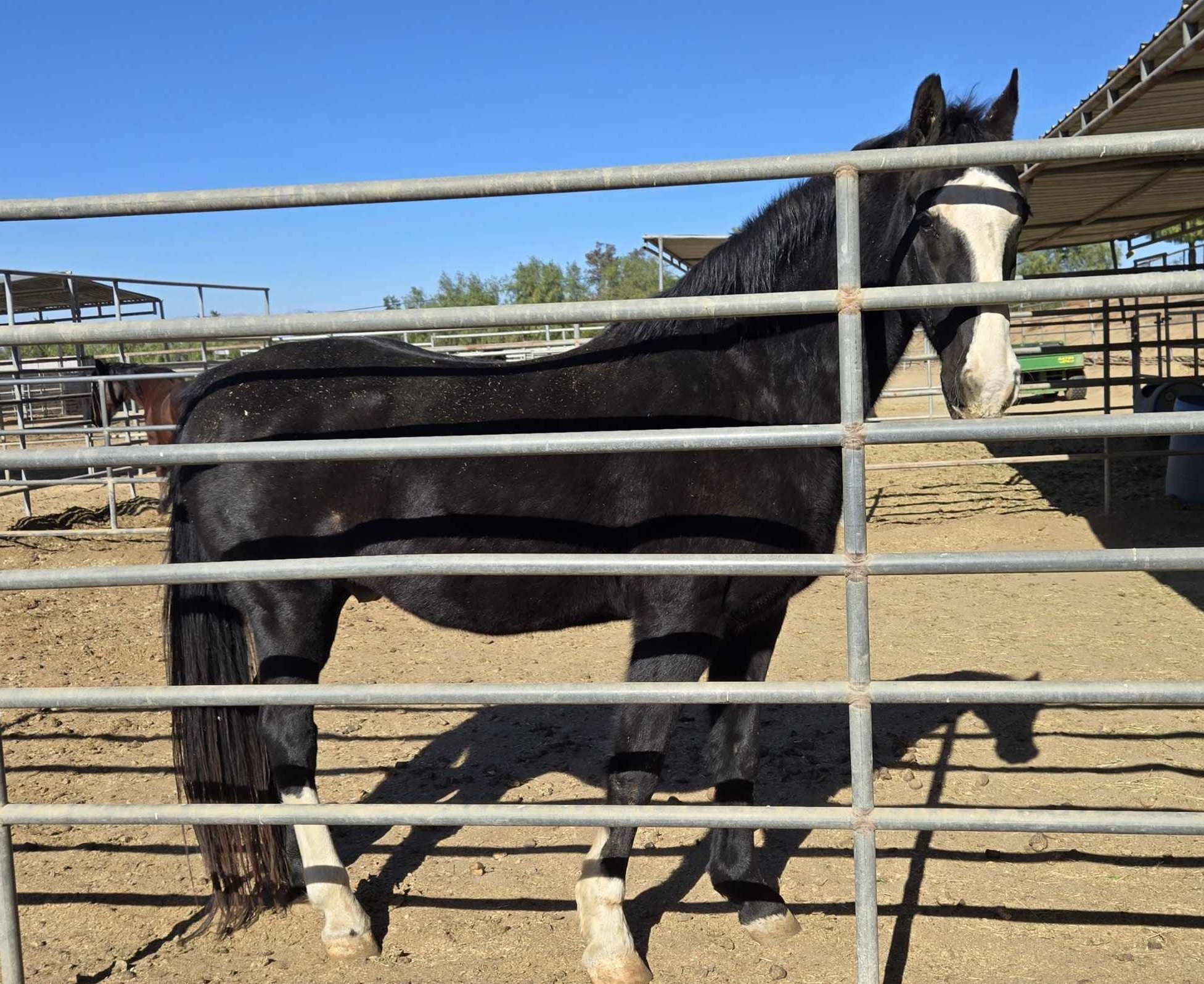 Jasper is a black and white Saddlebred who ended up in a killpen in 2021 when he was just five years old. He presented with significant atrophy in his right hip. It turned out that at some point his pelvis had been fractured, but he also had numerous lacerations on his tongue and ulcers on his lips. Clearly, he had been abused and traumatized. He is now doing well in sanctuary at TIER and his personality is shining through! He is what Gail calls, “One of our current ‘Dennis the Menace’ funny horses.”